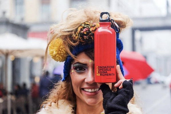 E’ la novità sostenibile di quest’anno: la borraccia in alluminio da 500 ml, rossa come il raduno dei Babbi Natale e con un omino blu con il cuore giallo come il simbolo della Fondazione e di tutti i bimbi del Regina Margherita 💛